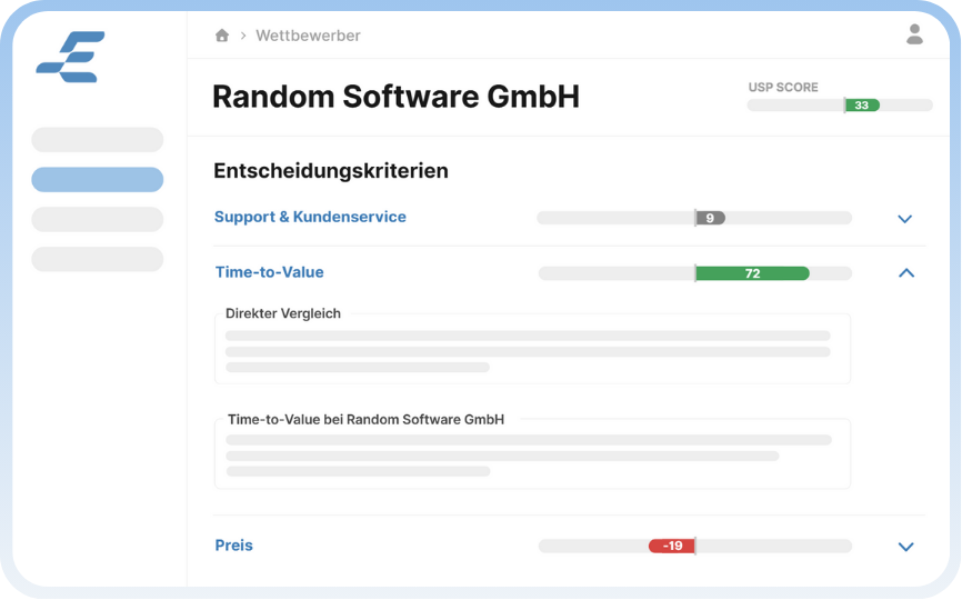 Mach es Kunden leicht, sich für deine Lösung zu entscheiden: Mit der detaillierten und immer aktuellen Wettbewerbsanalyse identifizierst du nachweisbare Alleinstellungsmerkmale und setzt dich gegen deine Konkurrenz durch.